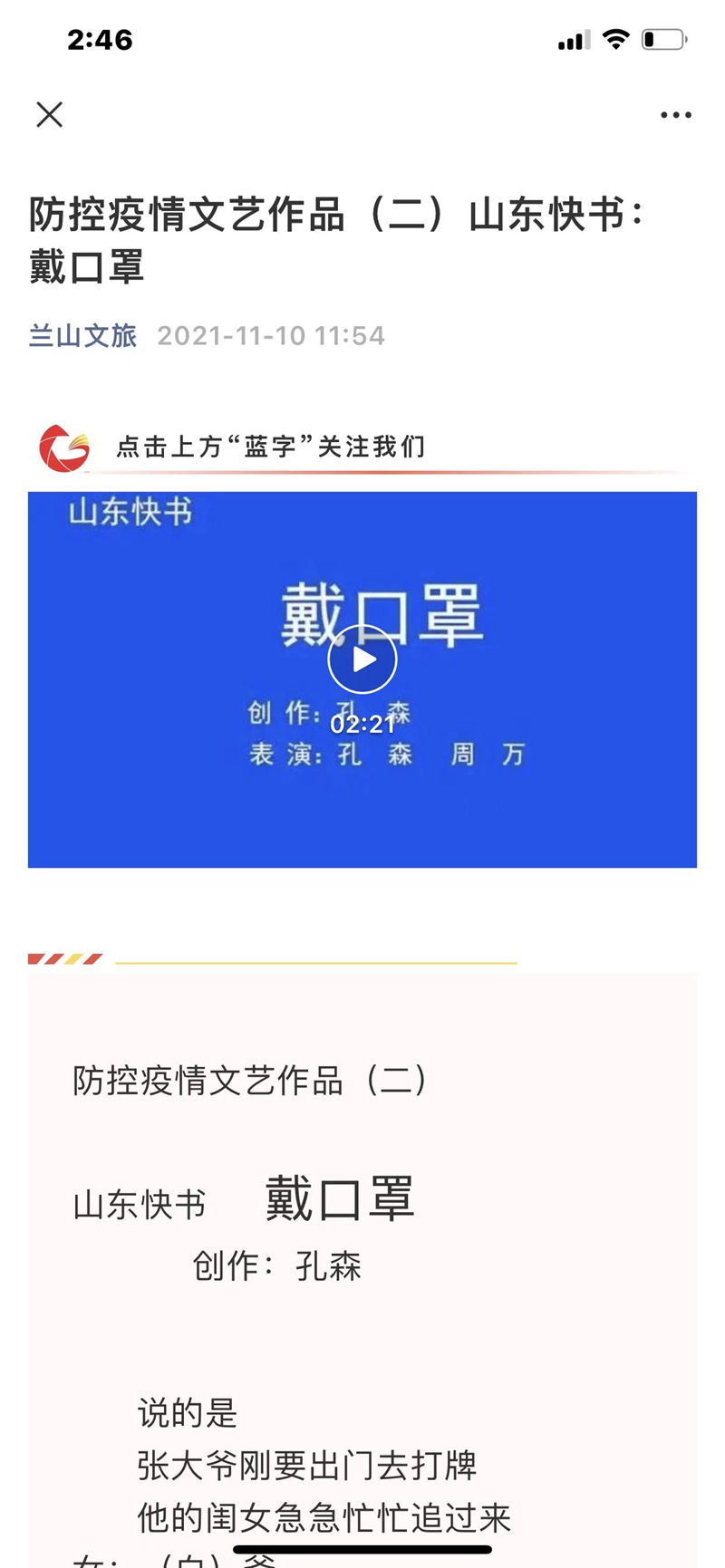 创作文艺作品,助力疫情防控。兰山区文旅局积极组织“抗疫”主题文艺节目创作,强化政府和群众文化正面宣传引导,涌现一批在疫情情况下打造的文化作品和艺术成果。如“音乐快板”《科学防疫要记牢》;“山东快书”《戴口罩》;“三句半”《打疫苗》等文艺作品。作品全部以喜闻乐见的形式和通俗易懂的语言,宣传普及了防控疫情的科学知识,为防控疫情起到积极作用。