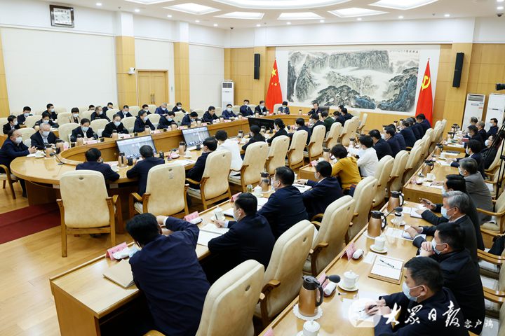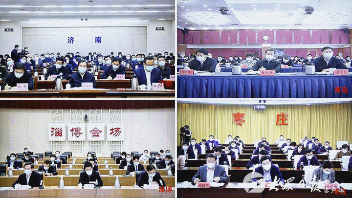 会议采取视频形式召开,省委常委和有关省领导、省委统筹疫情防控和经济运行工作领导小组成员单位主要负责同志在主会场参加会议。各市、县(市、区)设分会场。(大众日报客户端记者 刘兵 李子路 摄影 房贤刚)