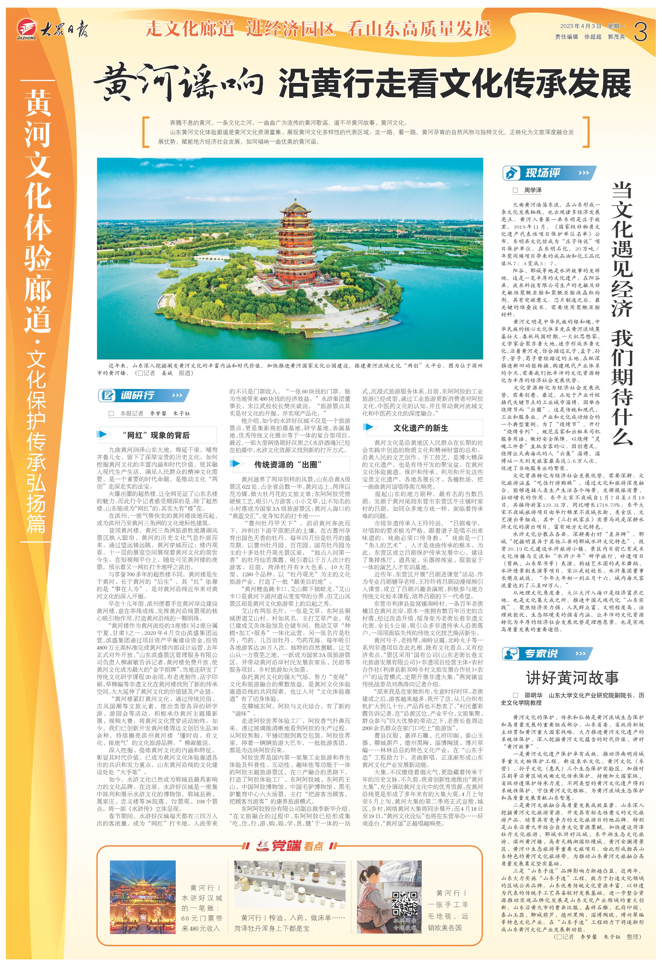 大集,不仅缭绕着烟火气,更隐藏着传承千年的历史文脉。不久前,我省创新性地推出“黄河大集”,充分调动黄河文化中的优秀资源,在黄河沿线更是形成了多年未有的大集大观。4月上旬至5月上旬,黄河大集的第二季将正式宣推,城区、乡村、网络黄河大集将同步展开;而4月18日至19日,“黄河文化论坛”也将在东营举办……好戏连台,“黄河谣”正越唱越响亮。