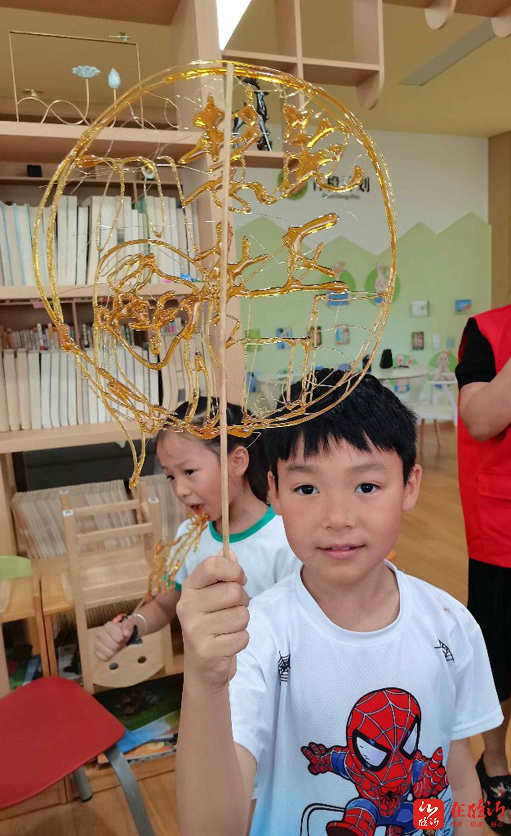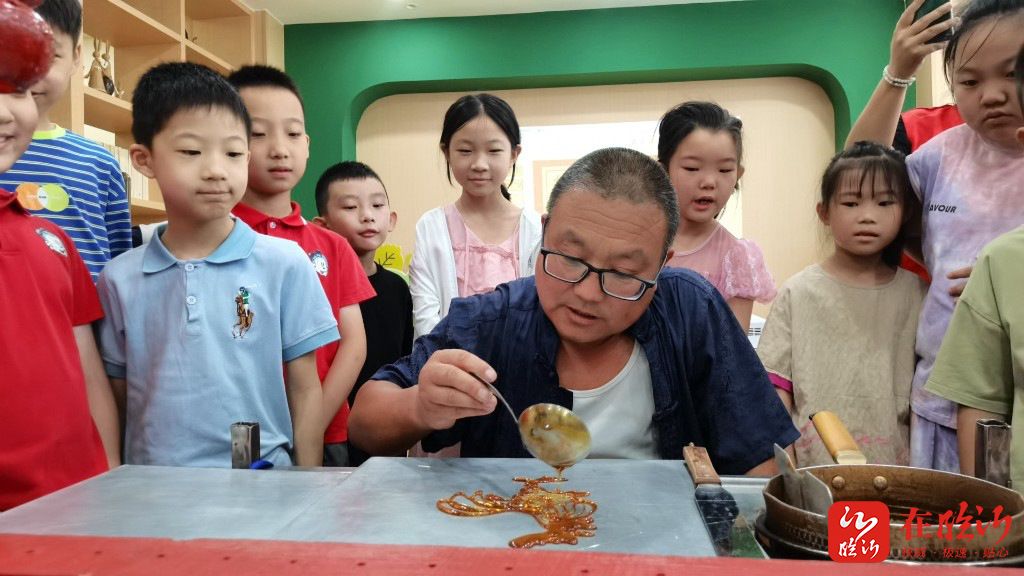 非遗传承人胡怀伟手把手教孩子们制作糖画。