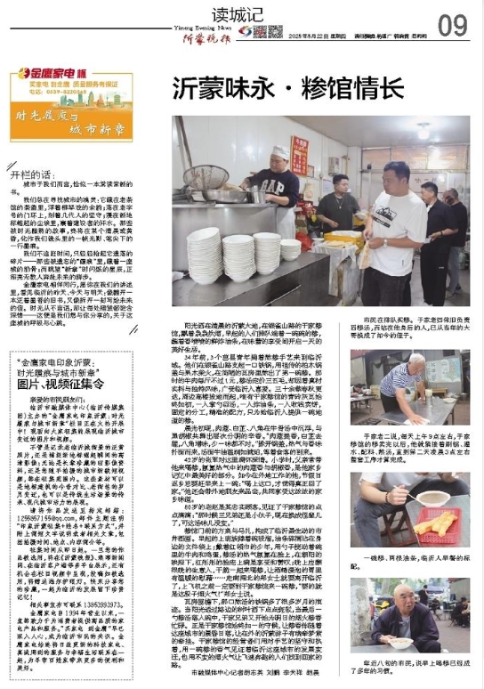 瓦房屋檐下,那口熬汤的铁锅多了很多岁月的痕迹。当阳光透过路边的树叶洒下点点斑驳,当最后一勺糁汤落入碗中,于家兄弟又开始为明日的烟火糁香忙碌。正是于家糁馆始终如一的守候,让糁香伴随着这座城市的晨昏日落,让在外的沂蒙游子有魂牵梦萦的牵挂。于家糁馆的经营者们用对手艺的坚守和执着,用一碗糁的香气见证着临沂这座城市的发展变迁,也用不变的烟火气让飞速奔跑的人们找到回家的路。