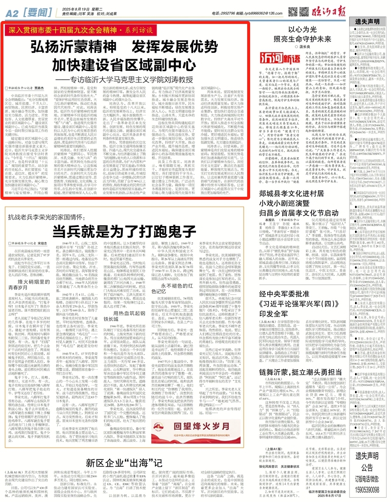 锚定建设省区域副中心这一战略目标,对奋力谱写现代化强市建设新篇章意义重大。近日,临沂大学马克思主义学院刘涛教授在接受专访时表示:“今年是‘十四五’规划收官之年,也是科学谋划‘十五五’规划的重要节点。站在新的历史起点,我们要紧扣‘走在前、进位次、提水平’的发展要求,大力弘扬沂蒙精神,充分发挥发展优势,凝心聚力加快建设省区域副中心。”