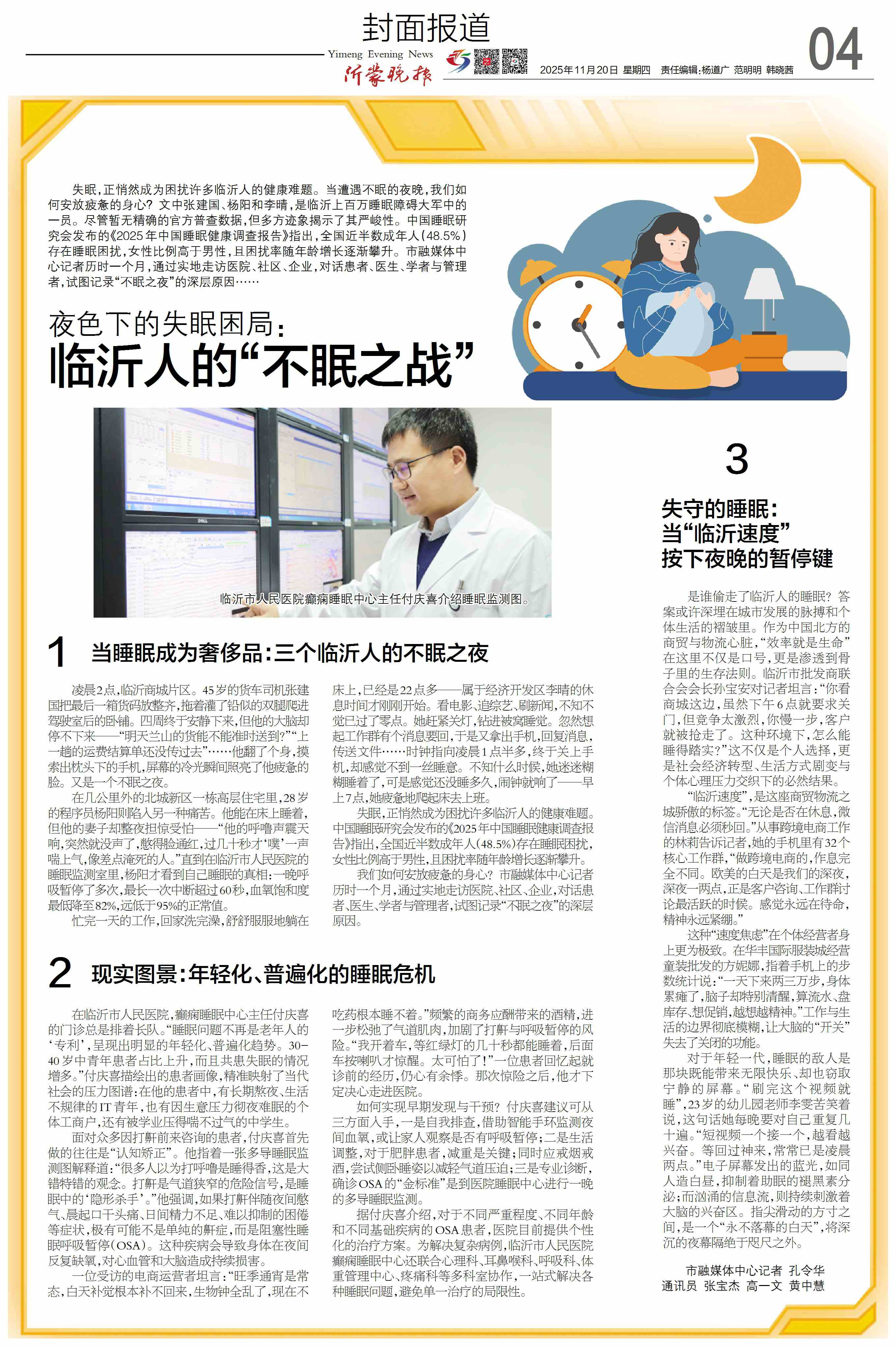 在临沂市人民医院,癫痫睡眠中心主任付庆喜的门诊总是排着长队。“睡眠问题不再是老年人的‘专利’,呈现出明显的年轻化、普遍化趋势。30-40岁中青年患者占比上升,而且共患失眠的情况增多。”付庆喜描绘出的患者画像,精准映射了当代社会的压力图谱:在他的患者中,有长期熬夜、生活不规律的IT青年,也有因生意压力彻夜难眠的个体工商户,还有被学业压得喘不过气的中学生。