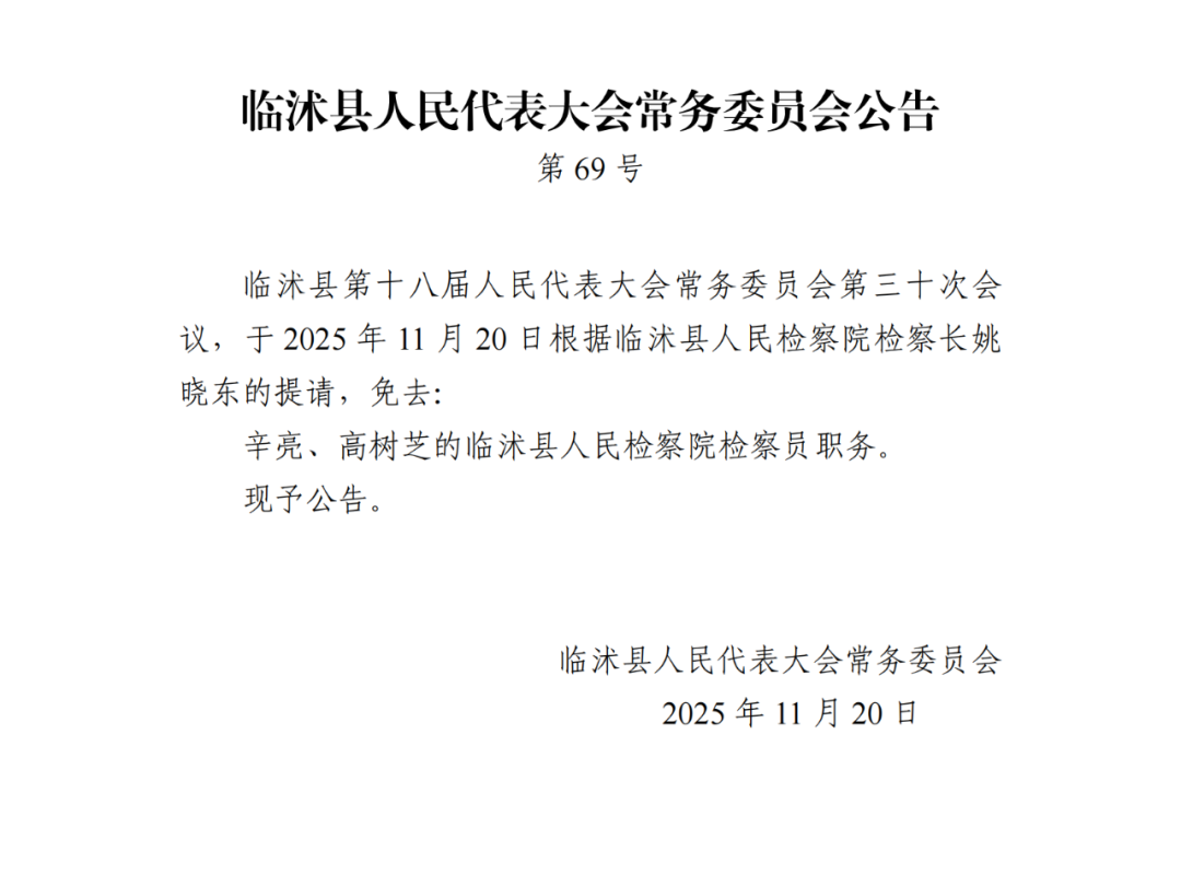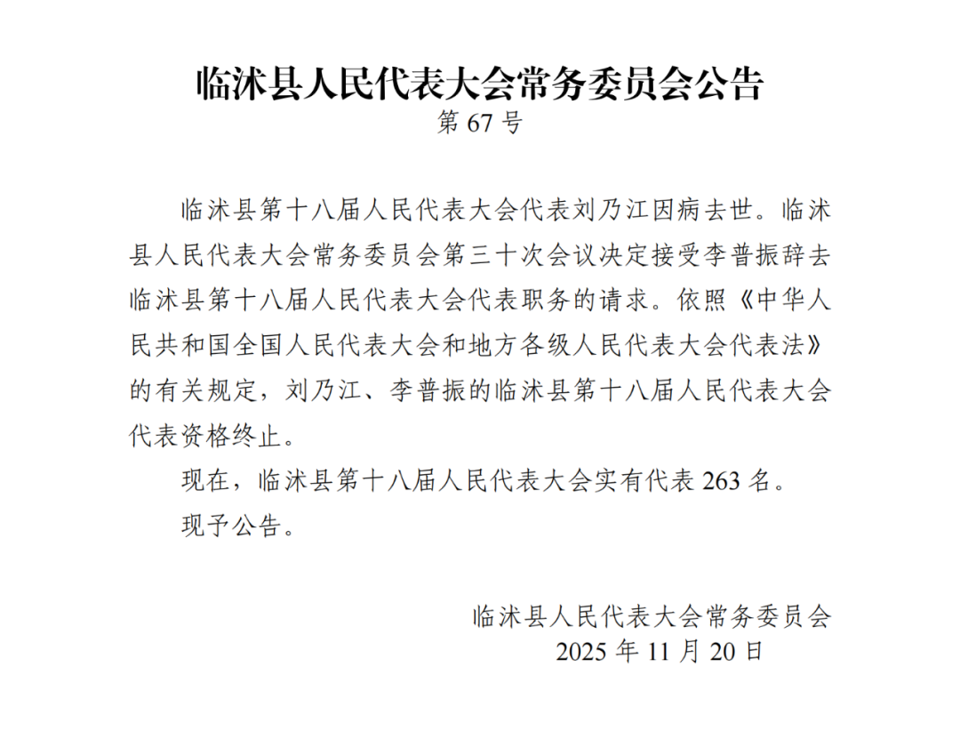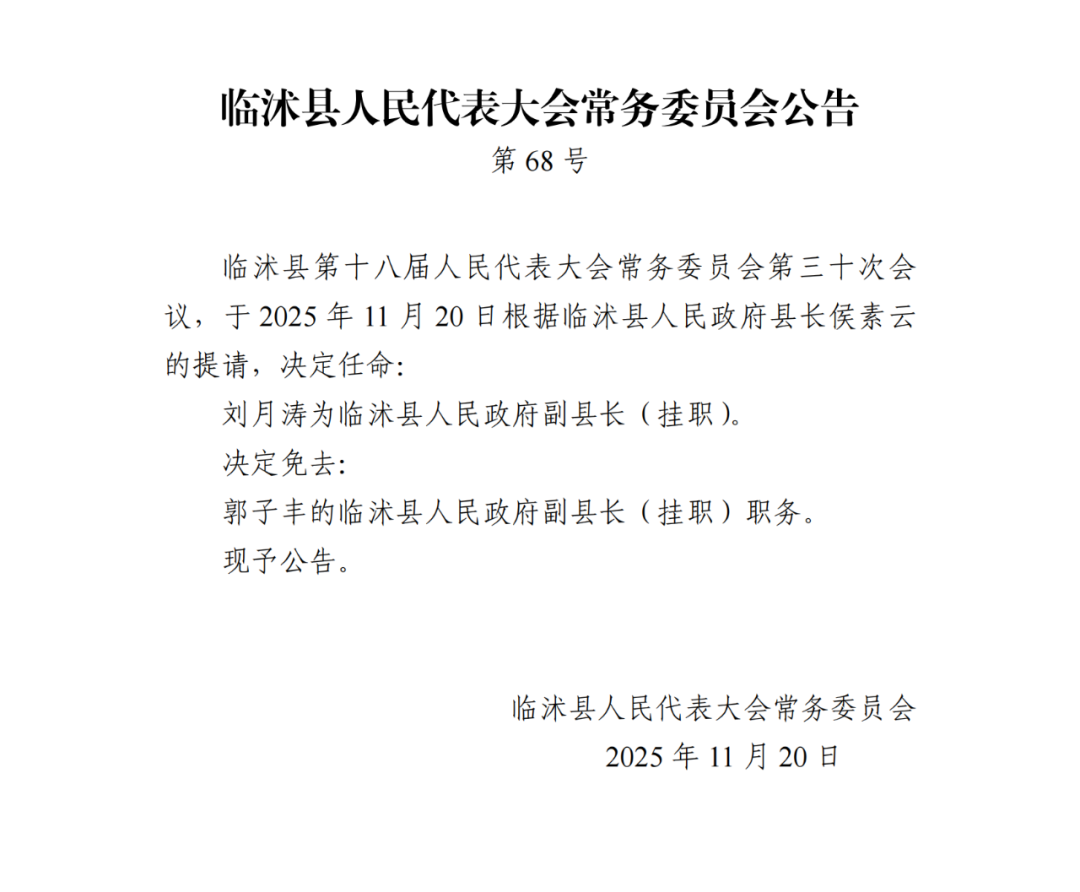11月20日,临沭县人民代表大会常务委员会发布一批公告,详情如下: